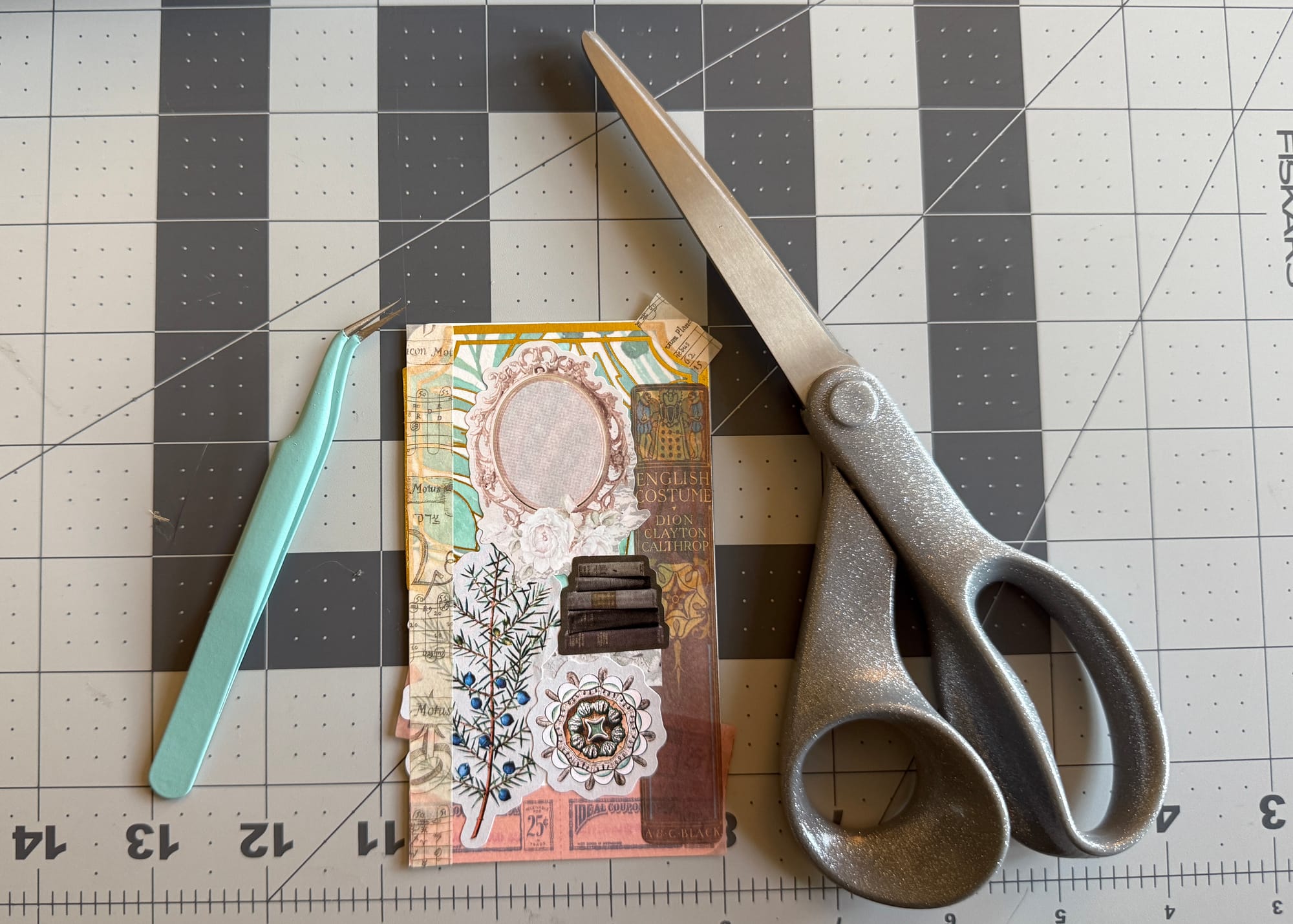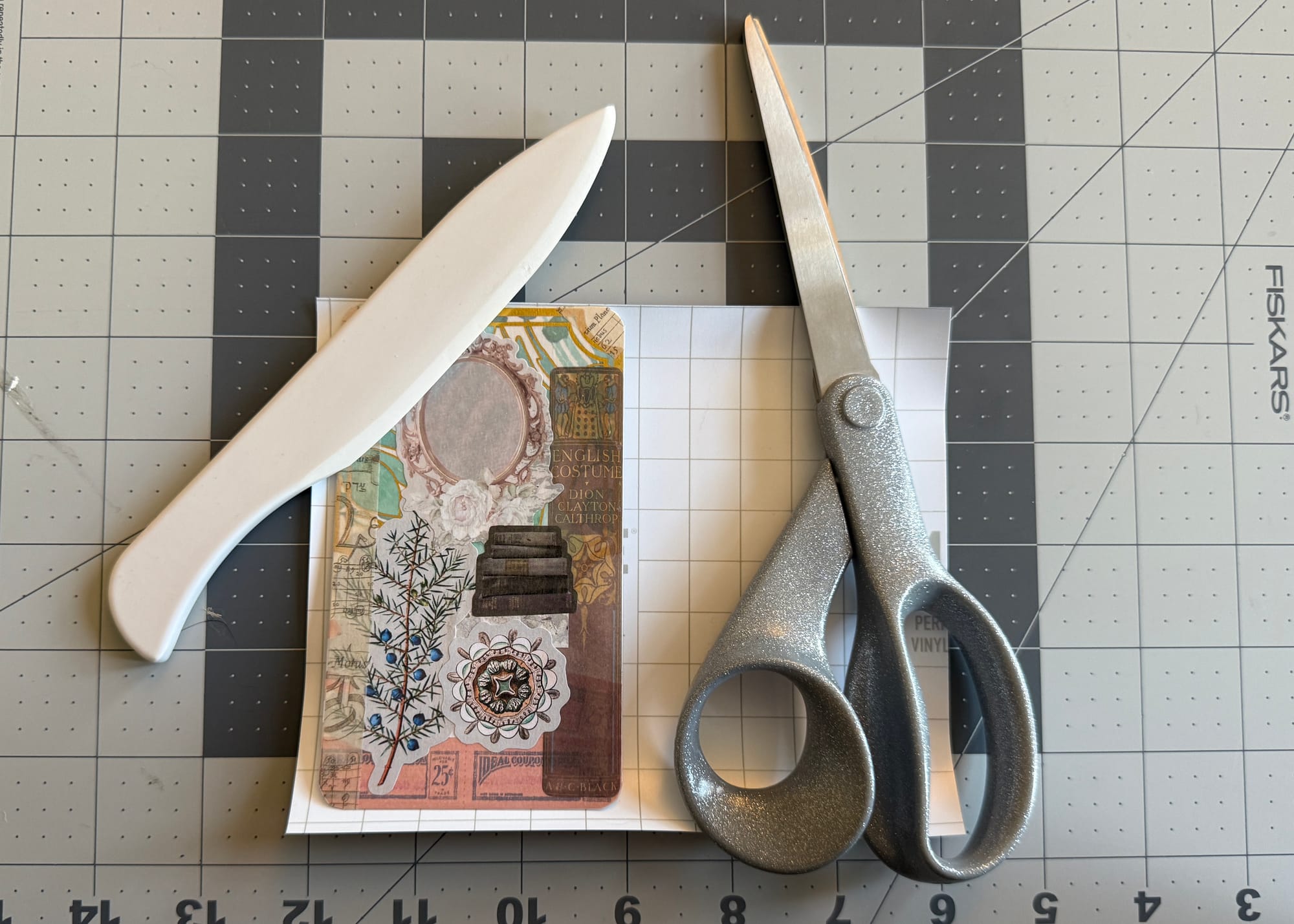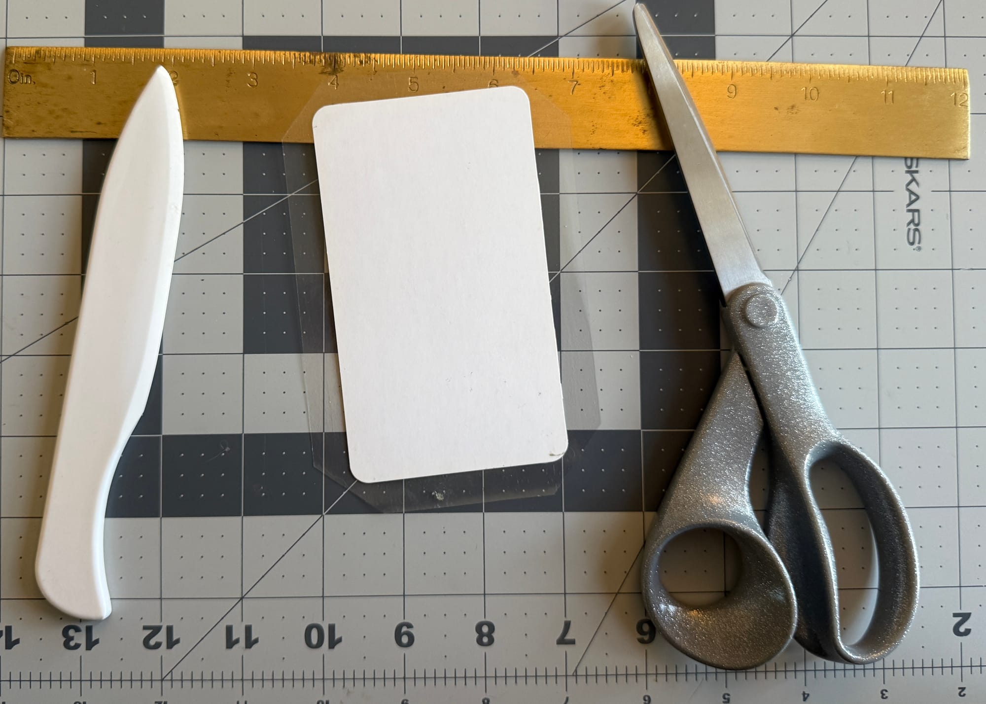 Once the card is done, trim around the edges so you don't have any excess sticker. You can use the rotary cutter for this, but the scissors were much easier for me.