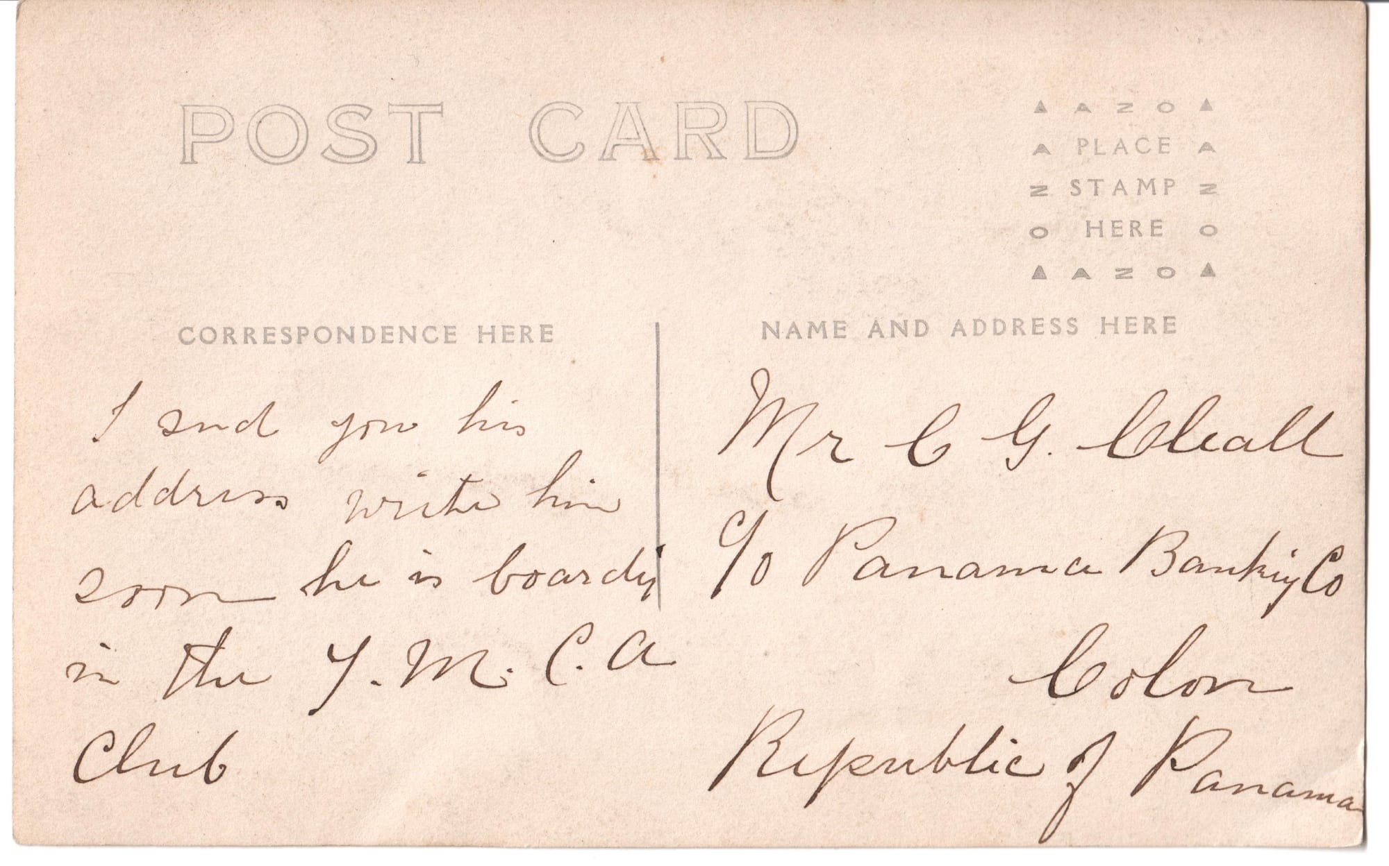 If this postcard dates from this time period, then it is likely the person was there during the US construction of the Panama canal. Could he have been working on the canal? I don't have any reason to believe he was or wasn't, but it would be interesting to think so. Maybe the person writing this postcard sent it with another letter to someone who wanted to keep in touch with someone working on one of the immense steam powered machines of American industry. Maybe he was part of the US Army Corps of Engineers. Or maybe he was just a tourist hanging out at the YMCA club and going onto the ocean in a small dugout with his buddy. While others were doing the dug out of the canal.