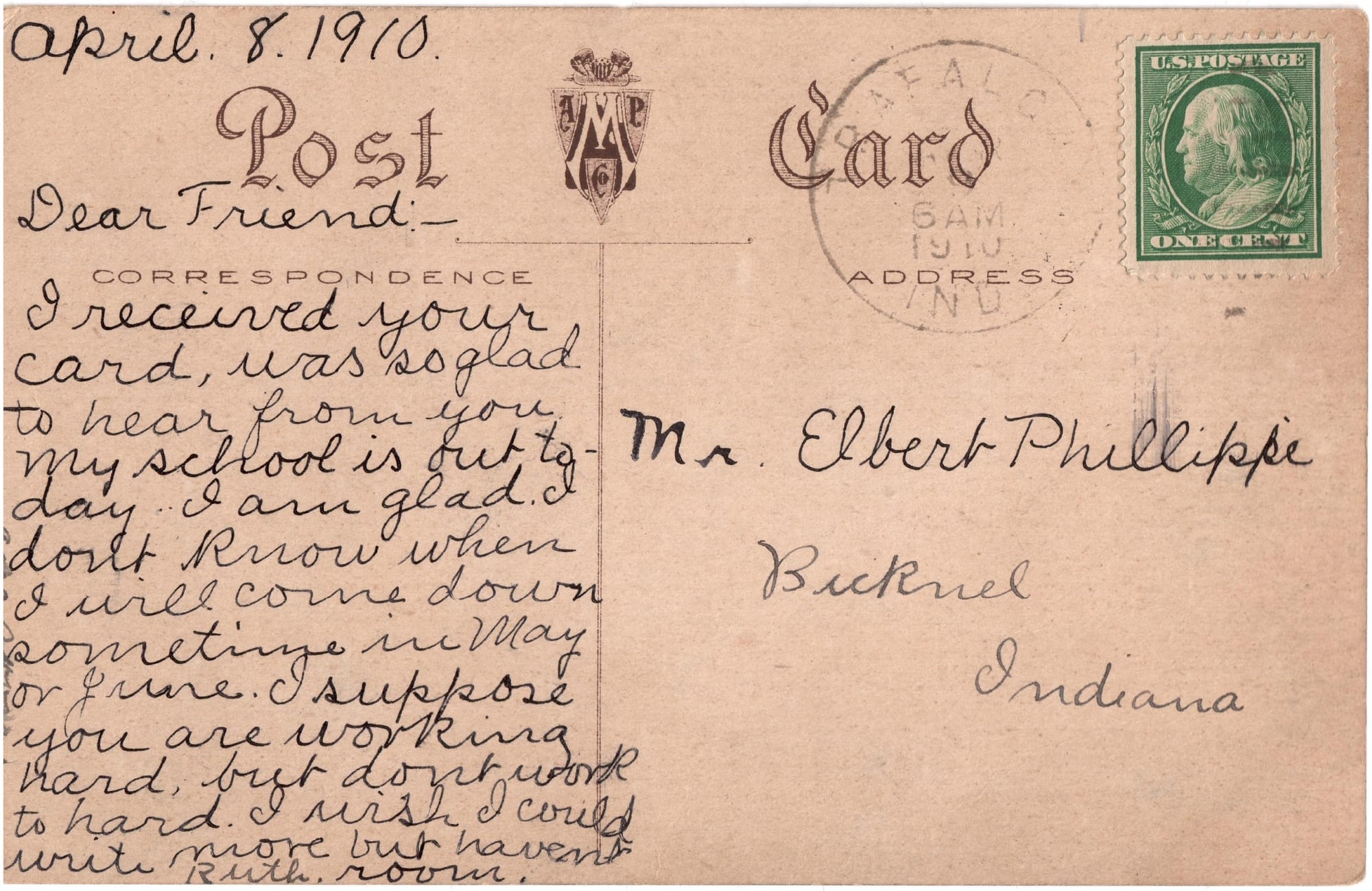 I received your card, was so glad to hear from you. My school is out to-day. I am glad. I don't know when I will come down sometime in May or June. I suppose you are working hard, but don't work too hard. I wish I could write more but haven't room.