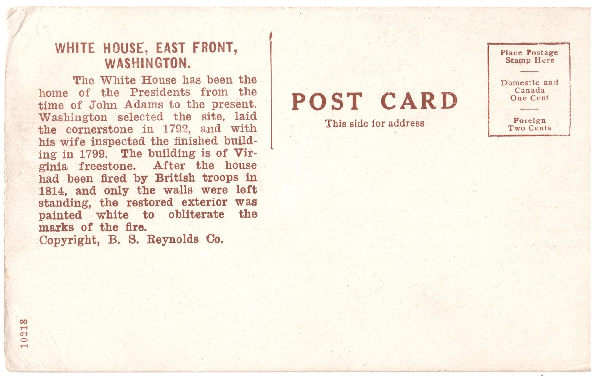 The White House has been the home of the Presidents from the time of John Adams to the present. Washington selected the site, laid the cornerstone in 1792, and with his wife inspected the finished building in 1799. The building is of Virginia freestone. After the house had been fired by British troops in 1814, and only the walls were left standing, the restored exterior was painted white to obliterate the marks of the fire.