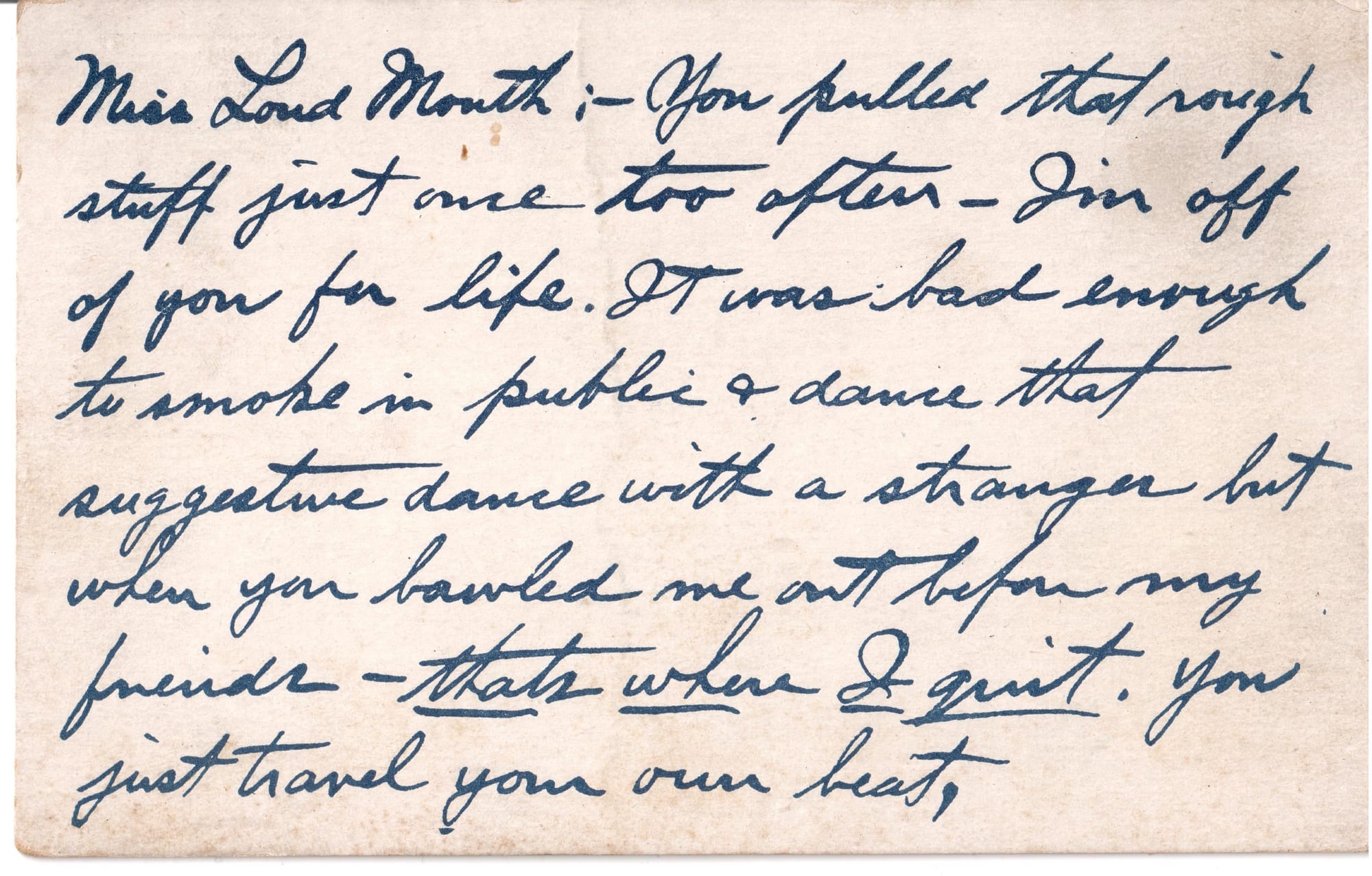 Miss Loud Mouth ;- You pulled that rough stuff just once too often – I'm off of you for life. It was bad enough to smoke in public and dance that suggestive dance with a stranger but when you bawled me out before my friends – that's where I quit. You just travel _your own beat.