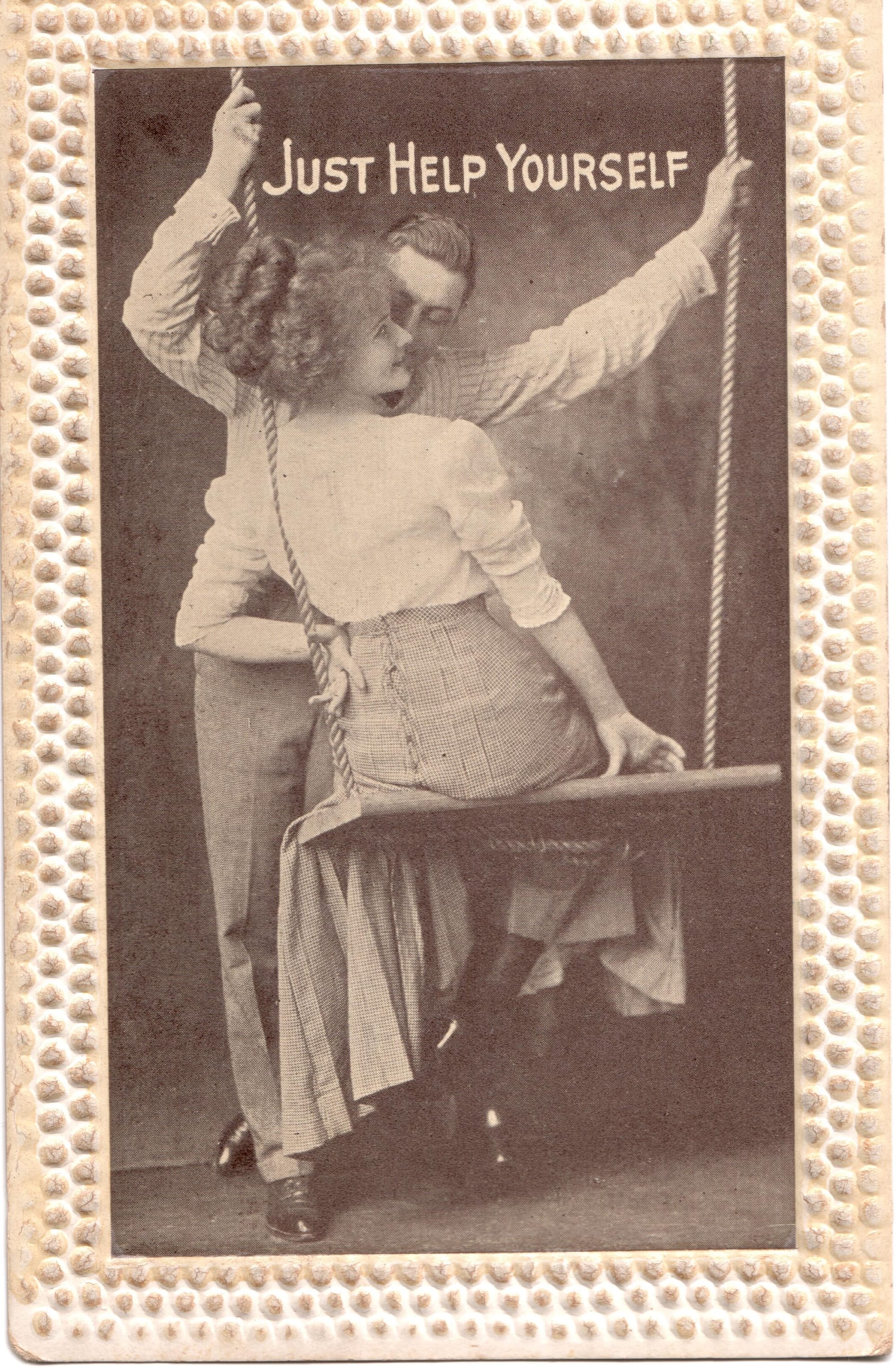 The back of the post card is stamped December 29, 1910. It's fun to imagine that the person sending it had an inside joke with Elbert to whom it was addressed. The combination of "Just Help Yourself" with the "Kark! Kark!" on the back absolutely makes me think that the unsigned addresser was flirting with Elbert.